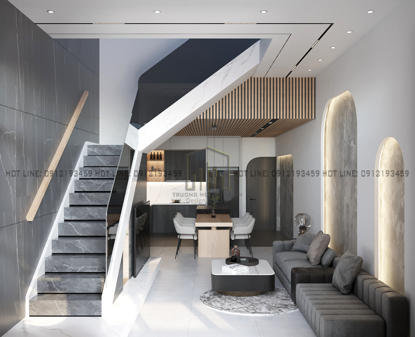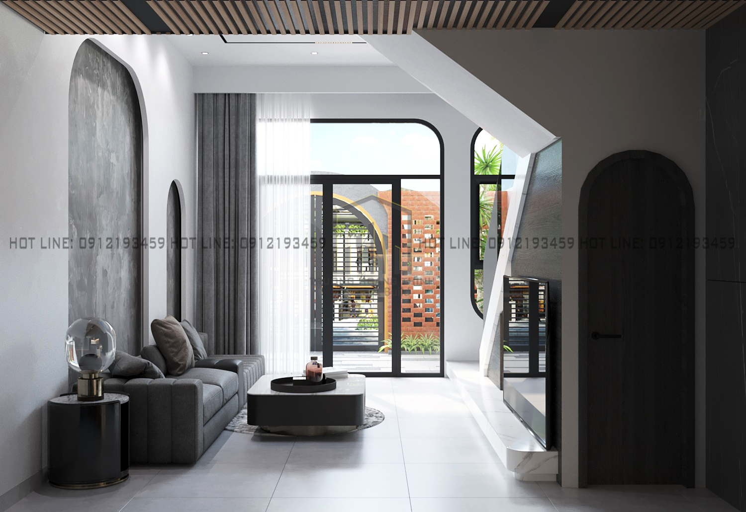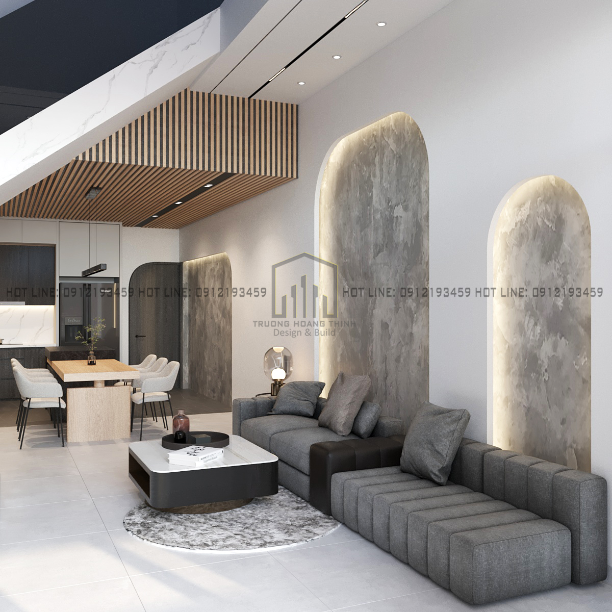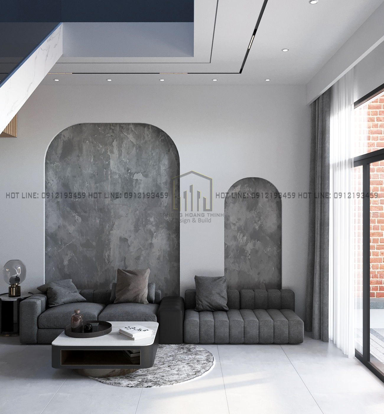 Với ngôi nhà của Mr.Nhựt, THT đã khéo léo sử dụng nghệ thuật những đường cong uyển chuyển giúp mặt tiền trở nên ấn tượng và độc đáo. Đặc biệt, sự kết hợp của những đường nét kiến trúc tối giản ở bên trong căn nhà cùng với tone màu xám – trắng làm chủ đạo càng khiến cho ngôi nhà trở nên hiện đại và sang trọng hơn.
