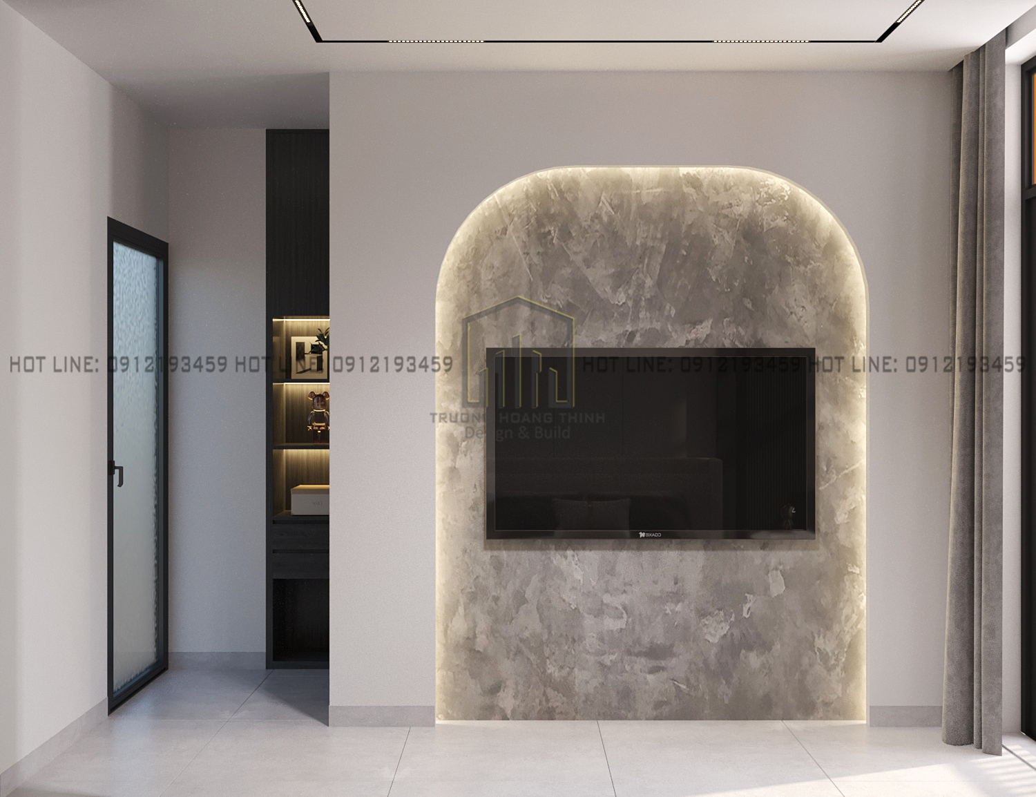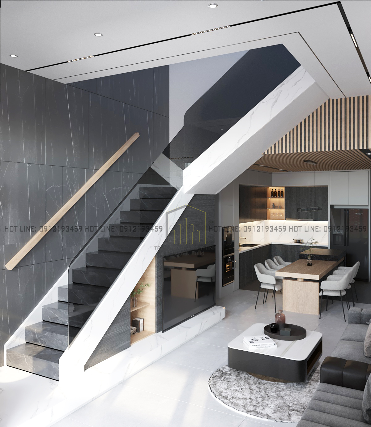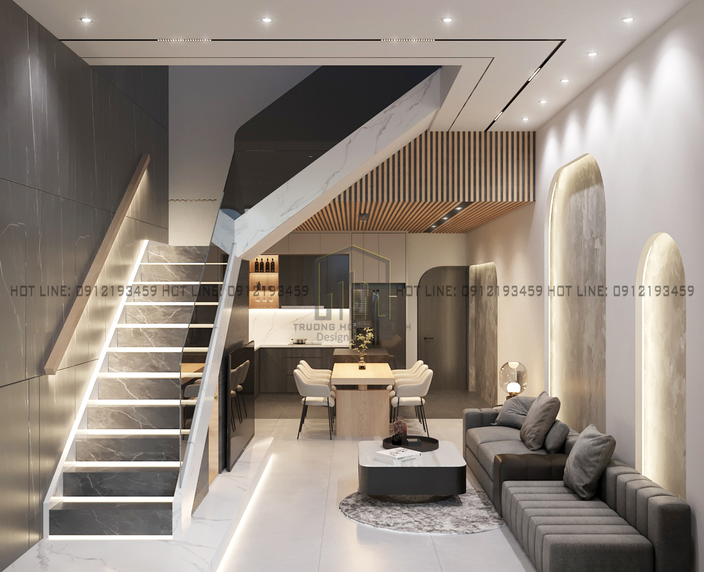 Với ngôi nhà của Mr.Nhựt, THT đã khéo léo sử dụng nghệ thuật những đường cong uyển chuyển giúp mặt tiền trở nên ấn tượng và độc đáo. Đặc biệt, sự kết hợp của những đường nét kiến trúc tối giản ở bên trong căn nhà cùng với tone màu xám – trắng làm chủ đạo càng khiến cho ngôi nhà trở nên hiện đại và sang trọng hơn.