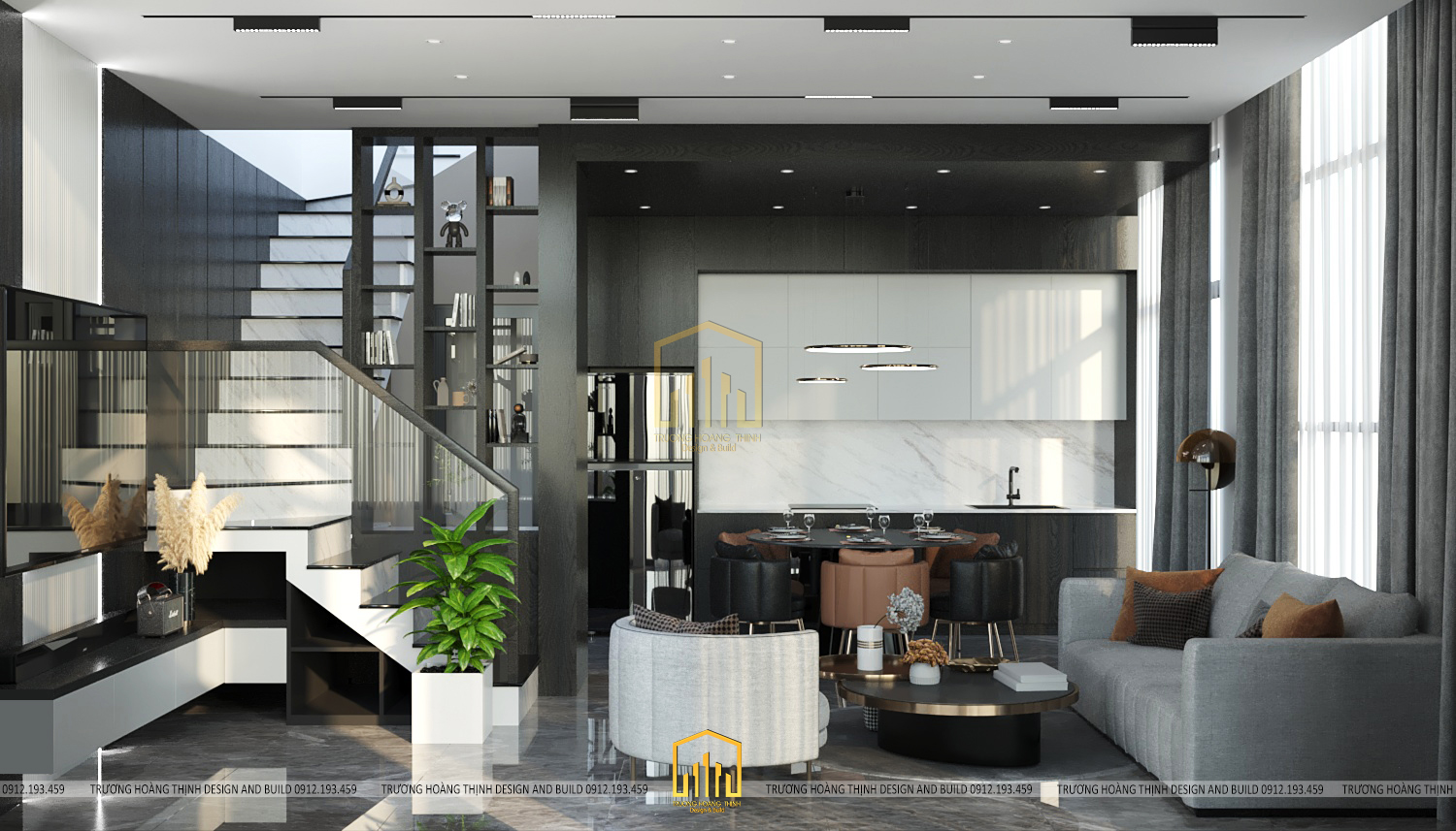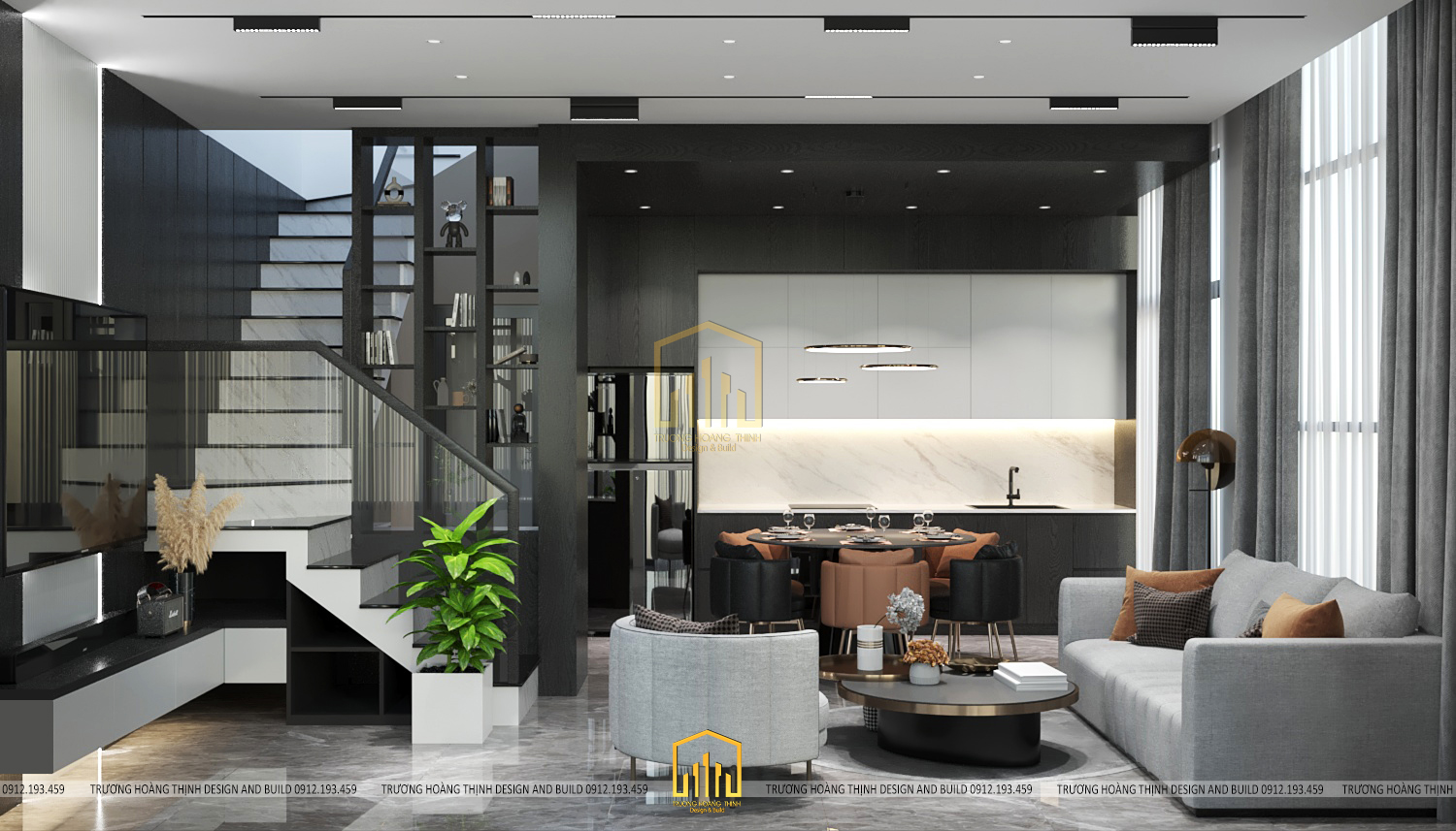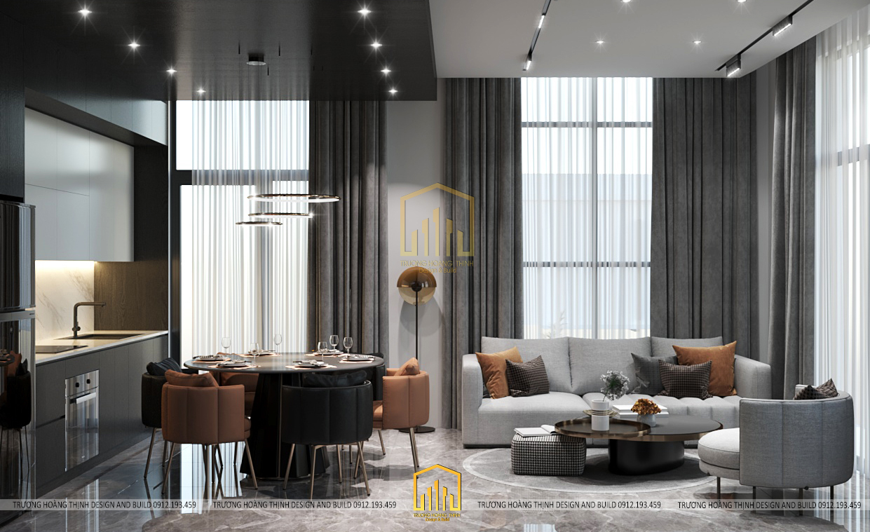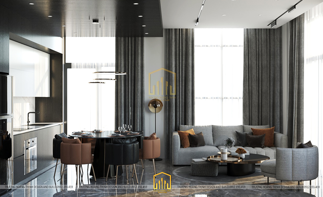 Tầng trệt được thiết kế theo không gian mở bao gồm phòng khách và phòng bếp để đảm bảo được sự rộng rãi, đáp ứng công năng thoải mái, đem lại sự thoáng mát và lưu không khí tốt trong ngôi nhà. Đặc biệt, với thiết kế này, gia chủ không ngớt lời khen bởi sự bố trí hợp lí giúp ngôi nhà ngập tràn ánh nắng đem lại không khí tươi mới ở mọi không gian.