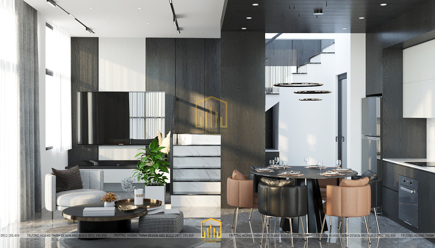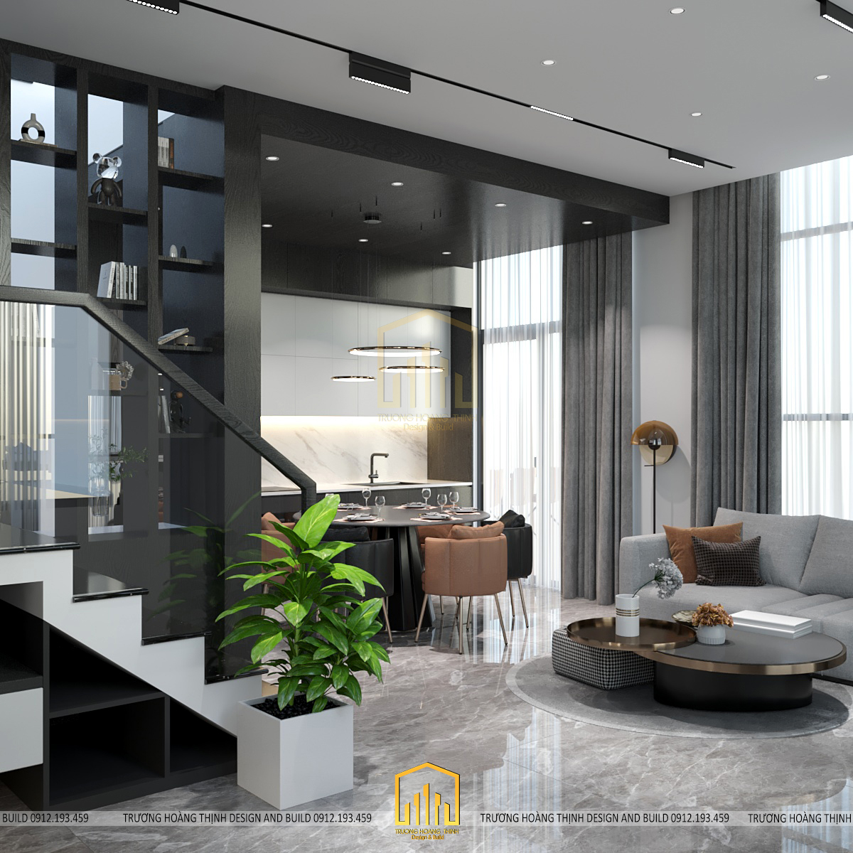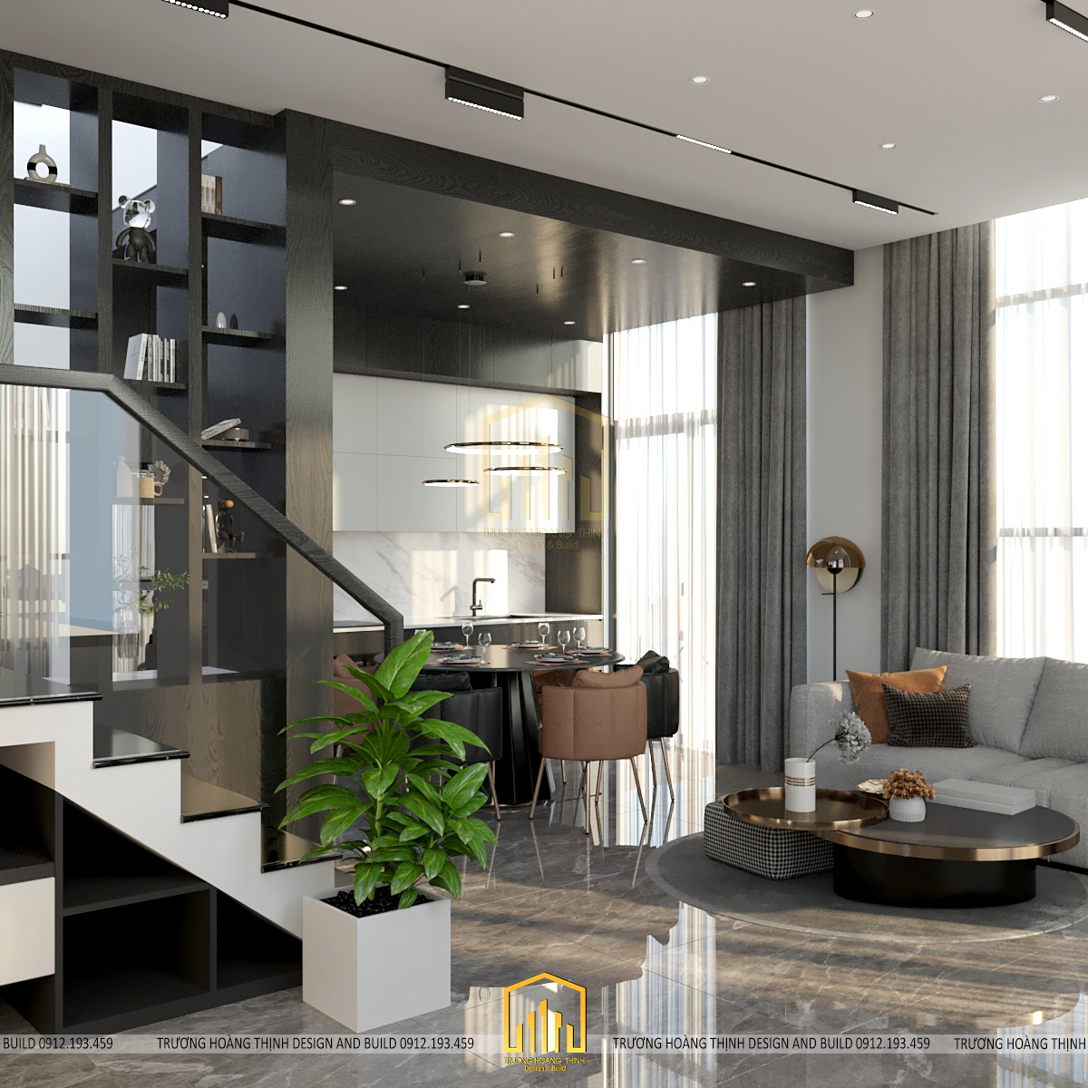Tầng trệt được thiết kế theo không gian mở bao gồm phòng khách và phòng bếp để đảm bảo được sự rộng rãi, đáp ứng công năng thoải mái, đem lại sự thoáng mát và lưu không khí tốt trong ngôi nhà. Đặc biệt, với thiết kế này, gia chủ không ngớt lời khen bởi sự bố trí hợp lí giúp ngôi nhà ngập tràn ánh nắng đem lại không khí tươi mới ở mọi không gian.